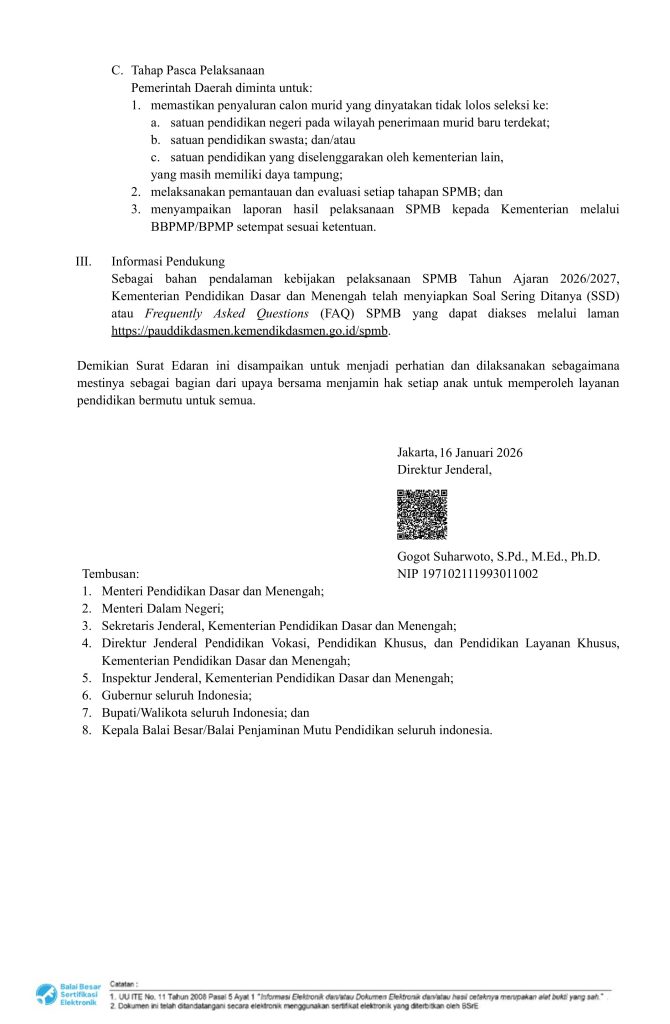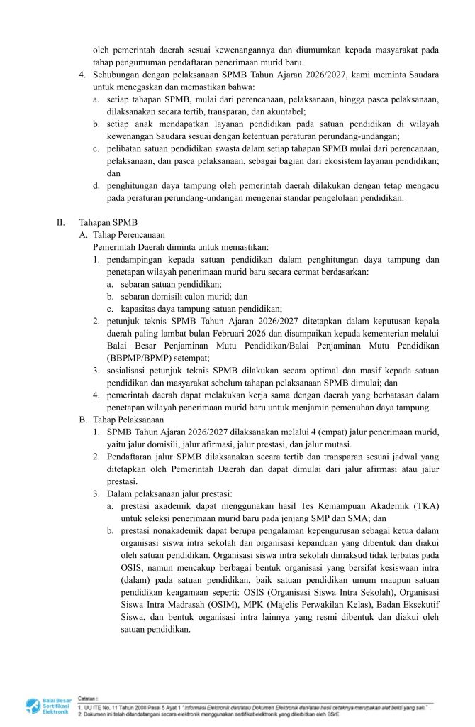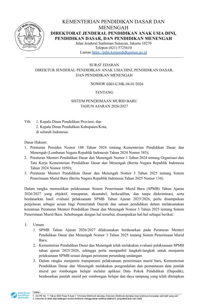 Nah, untuk memastikan pelaksanaan Sistem Penerimaan Murid Baru (SPMB) Tahun Ajaran 2026/2027 yang objektif, transparan, akuntabel, berkeadilan, dan tanpa diskriminasi. Pemerintah menyampaikan penjelasan sebagai acuan bagi Pemerintah Daerah dan satuan pendidikan dalam melaksanakan ketentuan Peraturan Menteri Pendidikan Dasar dan Menengah Nomor 3 Tahun 2025 tentang Sistem Penerimaan Murid Baru.