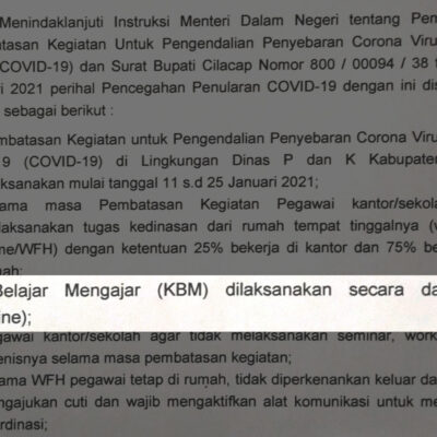 Kepala Dinas Pendidikan dan Kebudayaan Kabupaten Cilacap menerbitkan surat edaran tentang perpanjang masa Kegiatan Belajar Mengajar (KBM) di rumah. Disebutkan pada surat edaran Nomor: 443.1/1358/02/15 […]